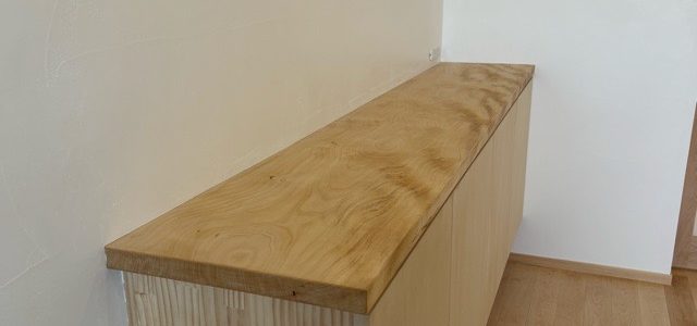 天然木でカウンター 2026-01-28 施工現場日誌 家具類はほぼ手作業、大工さんの腕によって作っています。 ウレタン塗装されたテカテカの表情ではなく天然の”木”の素材そのものを 生かした作りです。 天板カウンターは銘木を使います。 【下駄箱】 下駄箱は”トチの木” 【上り框】 ”センの木”…