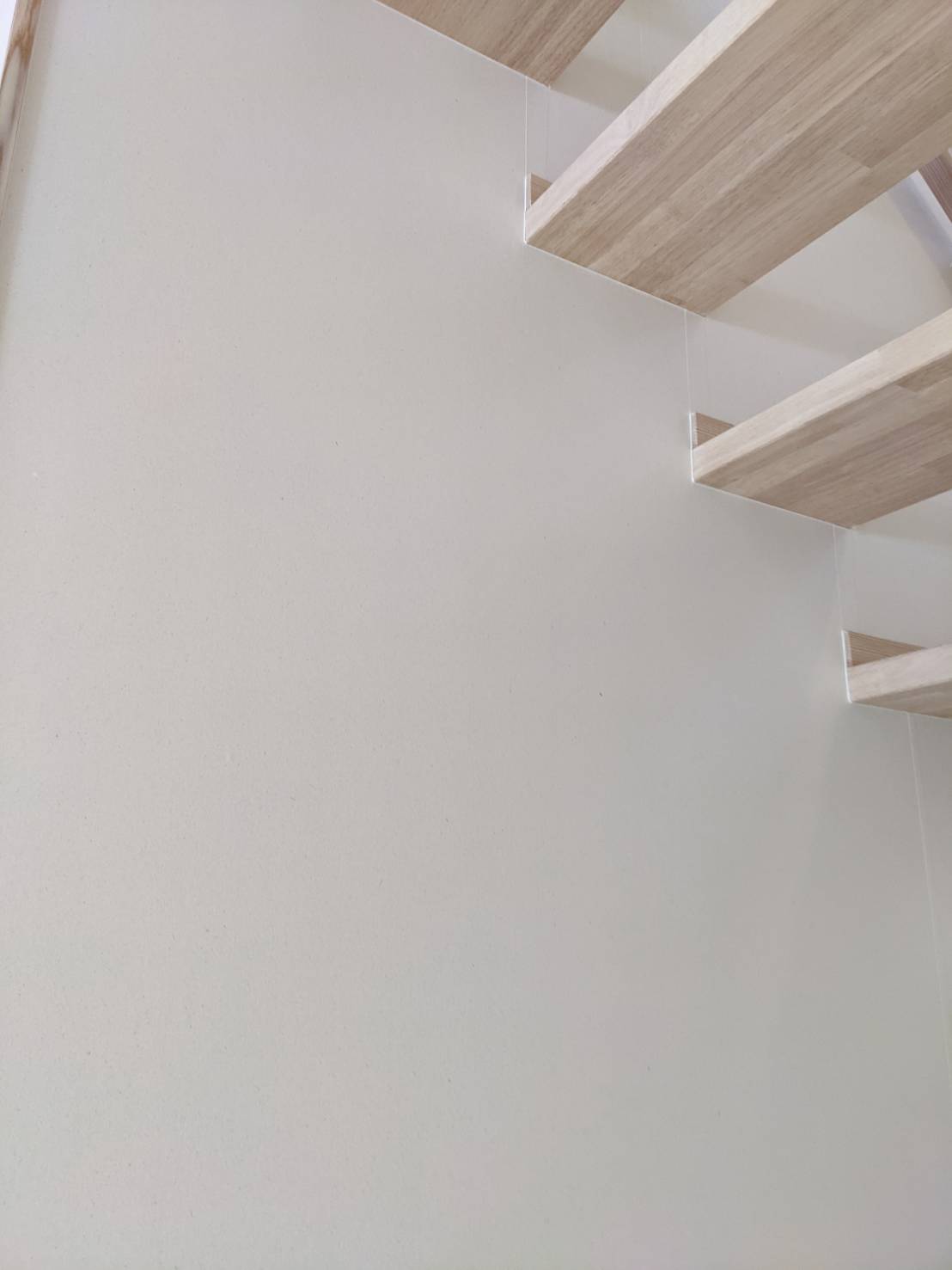 写真だと分かり辛いですが、一枚の壁紙で段板の端で一段ごとに切れ目を作り、