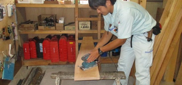 銘木カウンター作り 2019-07-04 施工現場日誌 現場監督の幸津です!(^^) 今日は新築現場で使う トイレカウンターを サンダーで磨きました。 綺麗に仕上がりました。 最後に自然塗料のオスモを塗って 完成です。