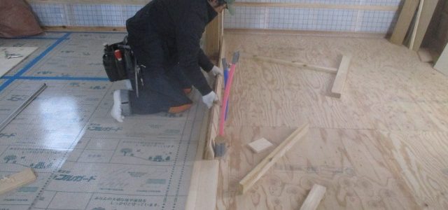 床張りを行っています。 2022-01-13 施工現場日誌 現場監督の幸津です(^^) 現場では無垢フローリング材(メープル)の 床張りを行っています。 木を当てながら叩き込んでいます。 均等に入れていかなければ誤差が生じますが 棟梁は綺麗に入れていきます。