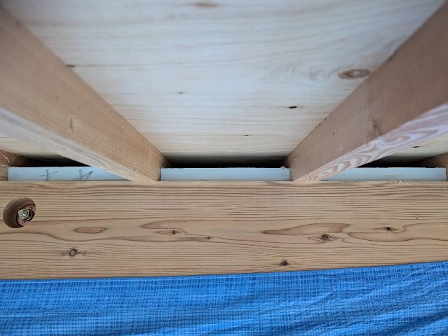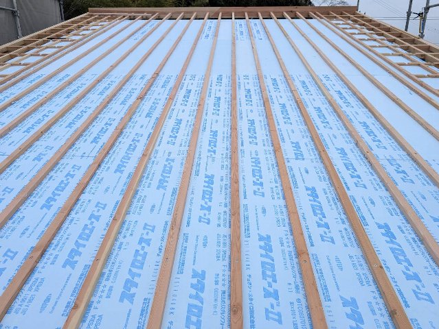 現場では屋根断熱の第一歩、付加断熱であるスタイロフォームを張り、空気の