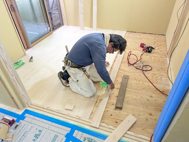 無垢フロア張りが進んでいます。 2025-11-14 施工現場日誌 現場監督の幸津です。 新築現場では内部のフロア 造作 や 収納 造作が進んでおります。 棟梁がフロアの小さいパーツを加工していて どこに使うのかと見ていたら 隅の張り始めに使っておりました。 何もない所はそのまま張れますが 出隅入隅がある所は張り始めに加工が必要で、 棟梁の職人の技を感じます。 大工工事完了までもう少しです。 YouTube「お施主様インタビュー」はこちら↓ お施主様からのお手紙やインタビューはこちら↓ 施工例はこちら↓ Follow Us Instagram↓