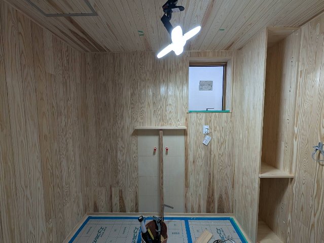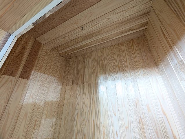 脱衣室にはも杉板を張りました。