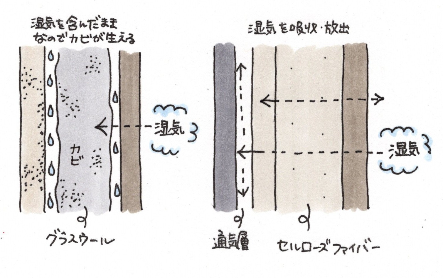 さらに、セルロースファイバーは調湿性にも優れており、湿気を吸収・放出することで結露を防ぎ、カビの発生を抑制します。