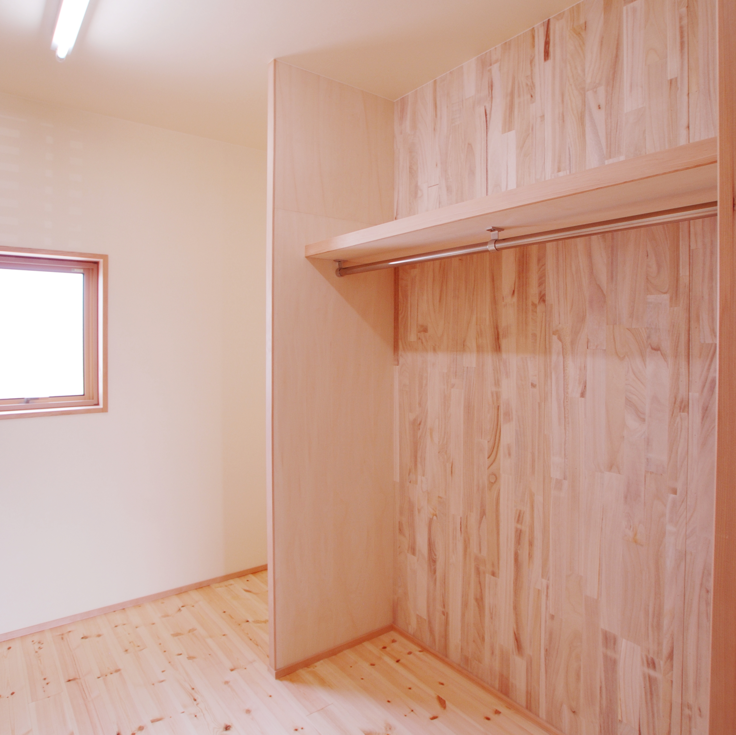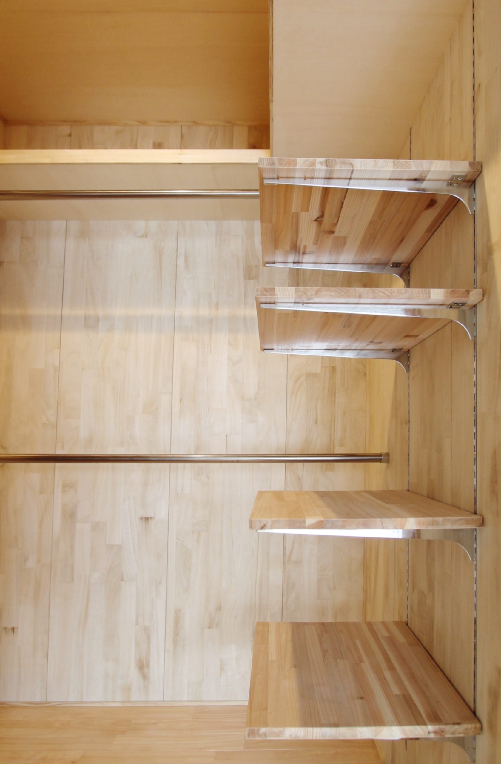 入り口横の壁には棚、奥に衣類をかけられるようにするなど収納方法を分けると、より使い勝手が