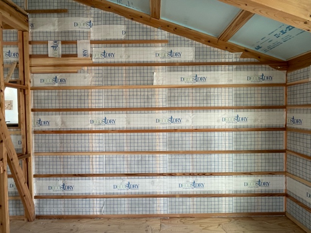 N様では壁のセルロースファイバー断熱材の吹き込みも完了しました。