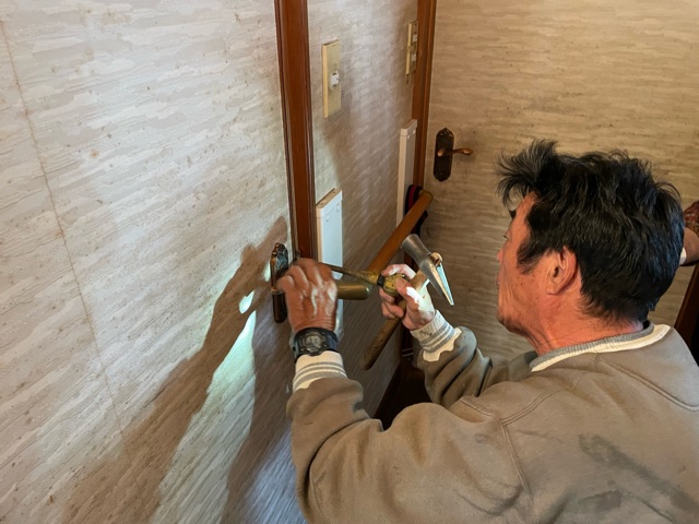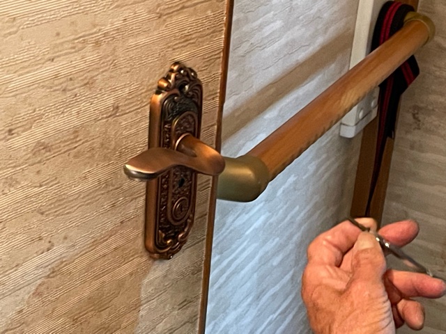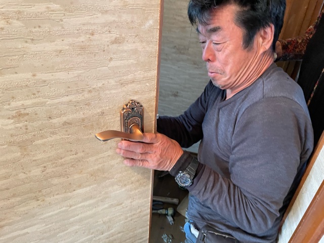 扉が開いて、次の課題はこの古い取手の位置に合うものがあるかということです。