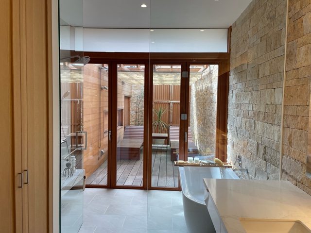 洗面室、浴室、中庭は透明ガラスでオープンです。