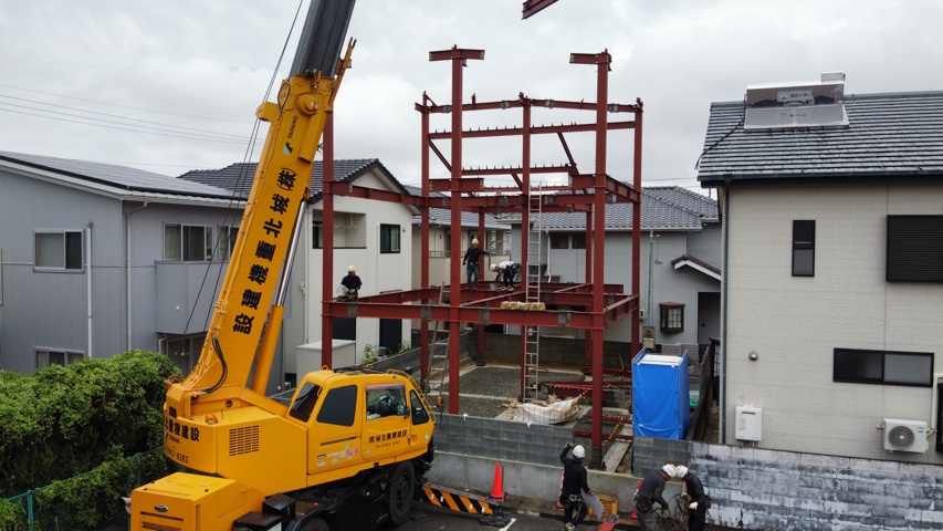 集成材が手に入らないということで急きょ計画変更、鉄骨造りに変更しました。