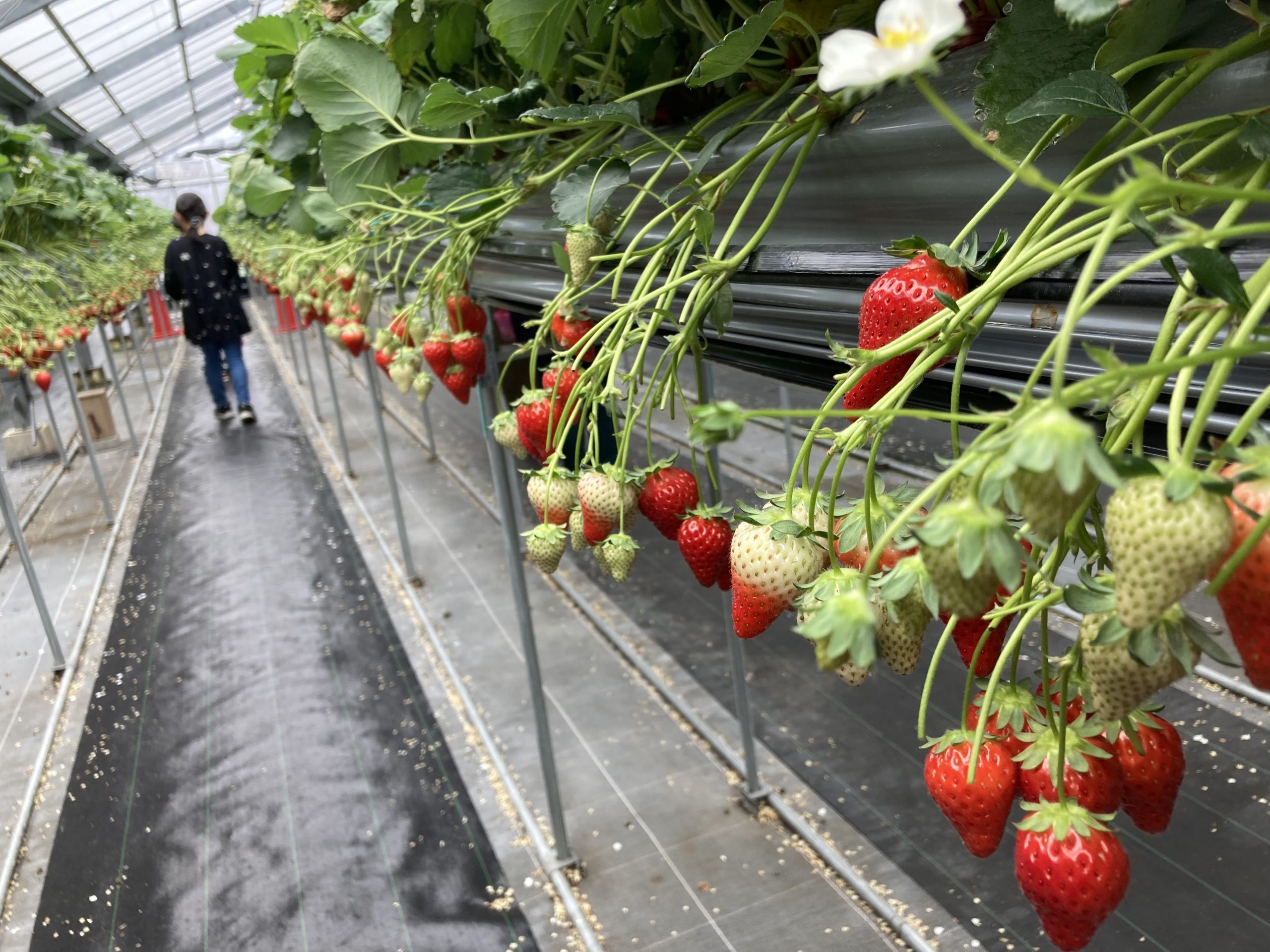 高設システムでの栽培をされている所なのでいちごがぶら下がっていて