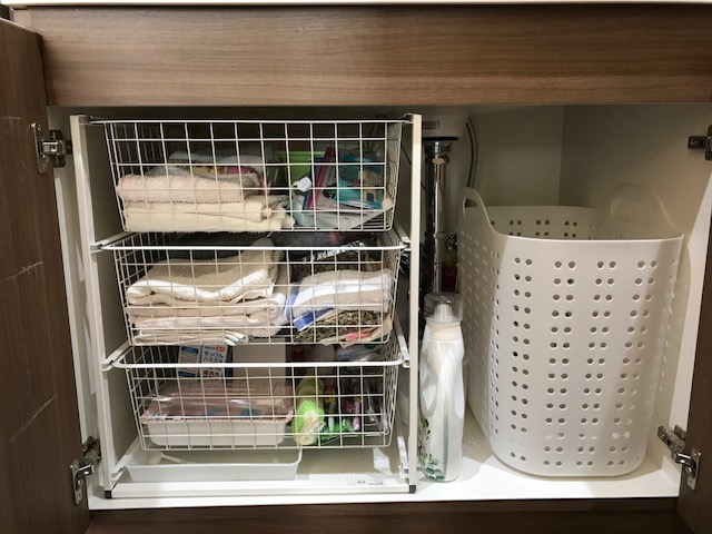 ①洗面・脱衣所に洗濯籠⇒洗面下に入る大きさを確認し新たに購入。無事解決。
