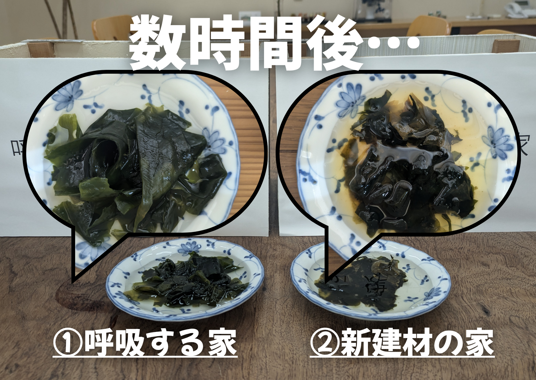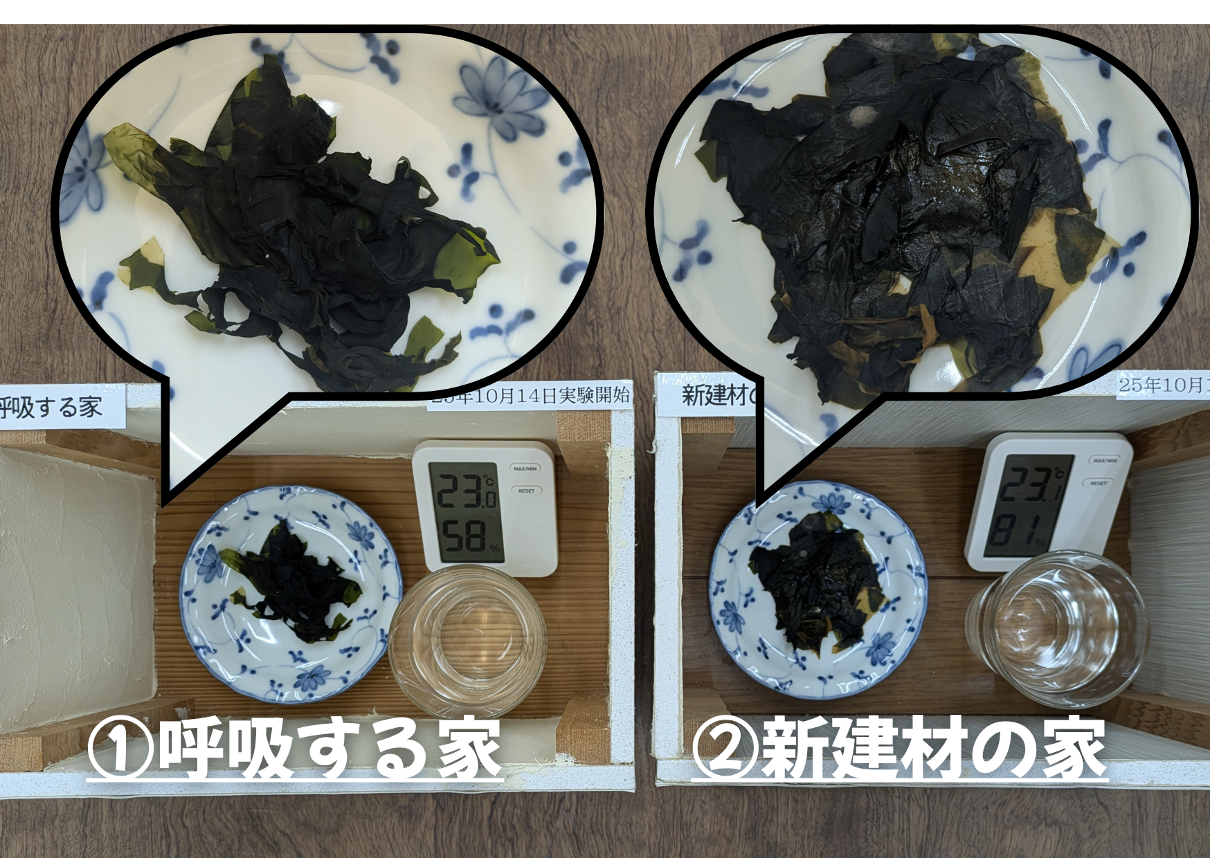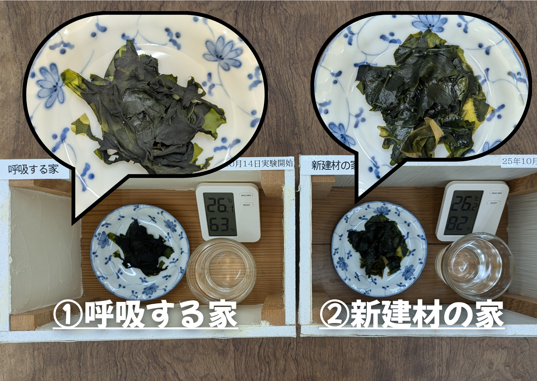 「呼吸する家」では、乾燥ワカメにまた戻って、「新建材の家」では、カビが出て終わり・・・