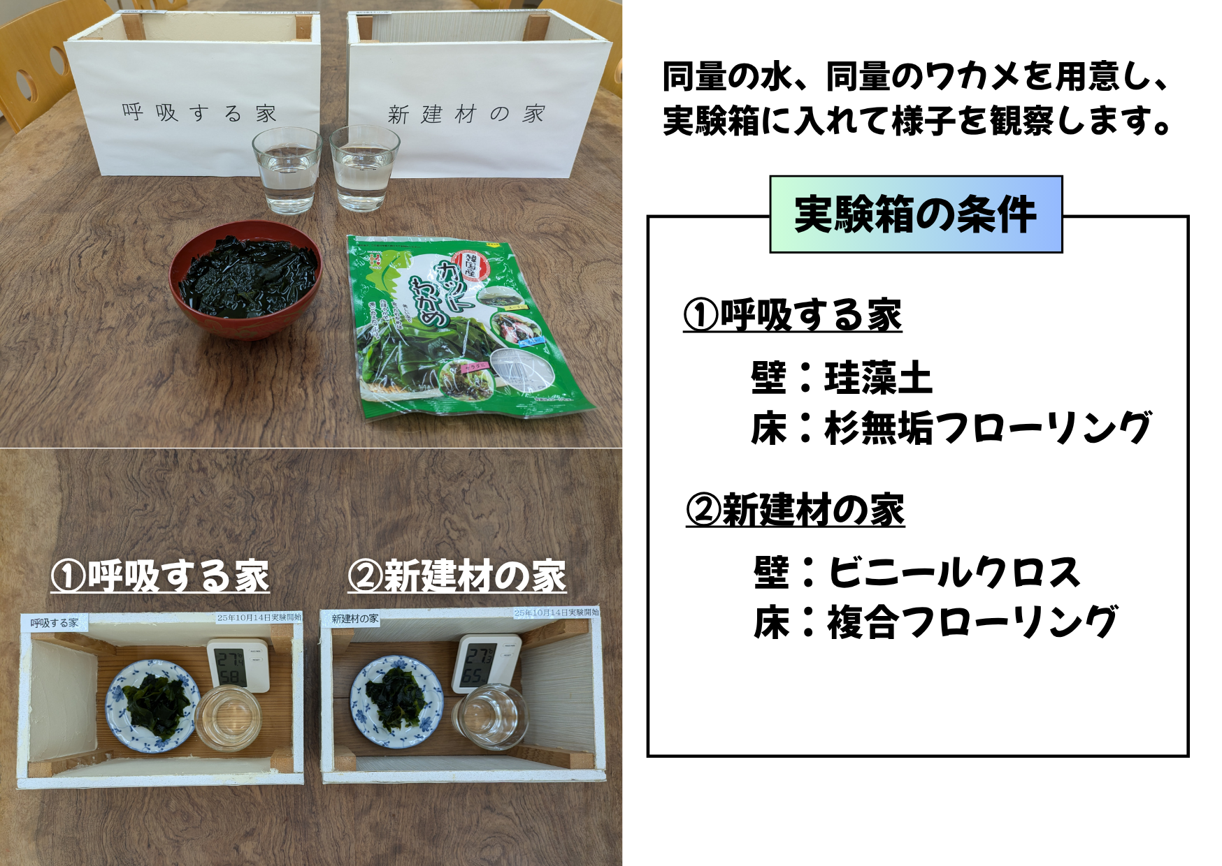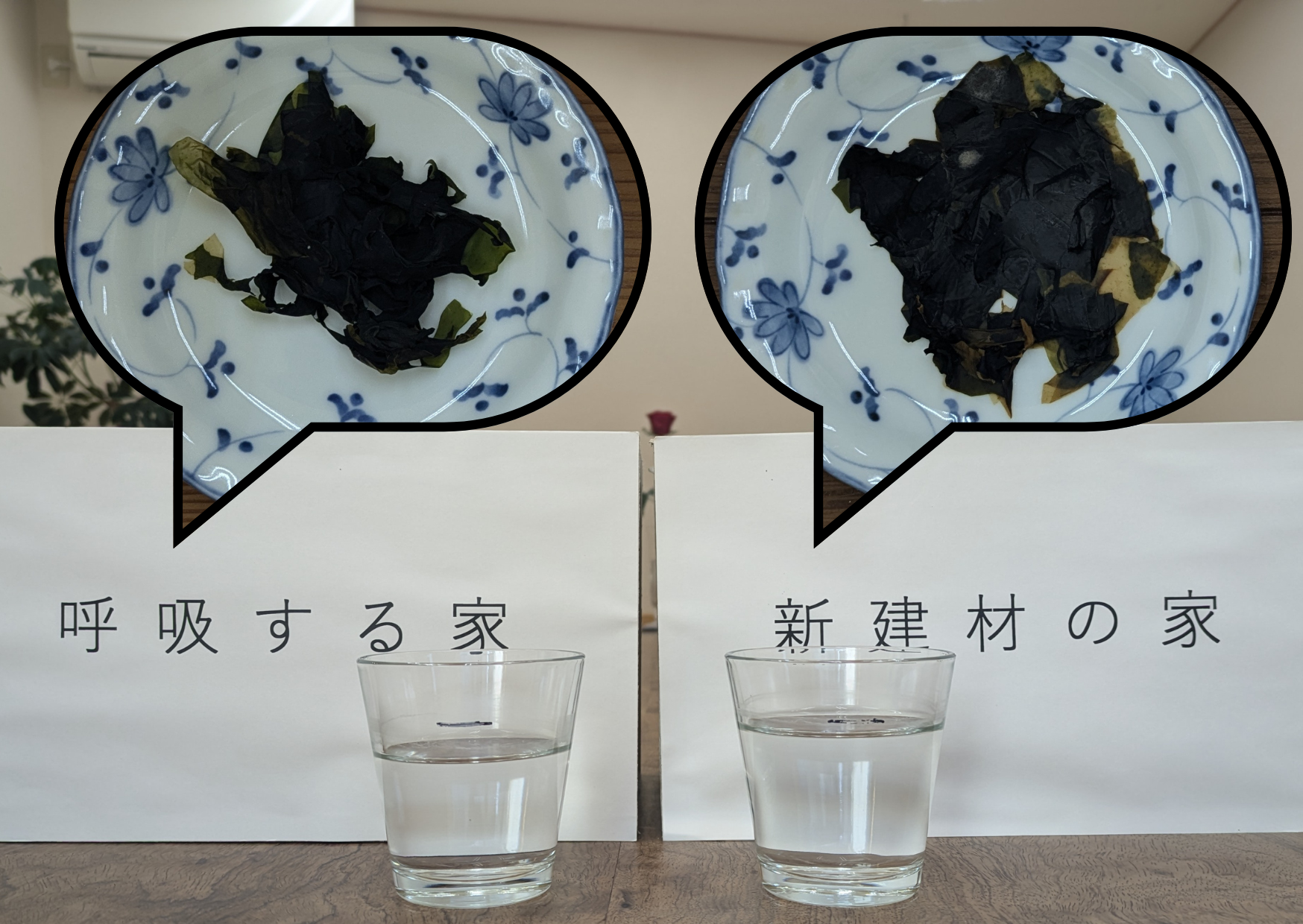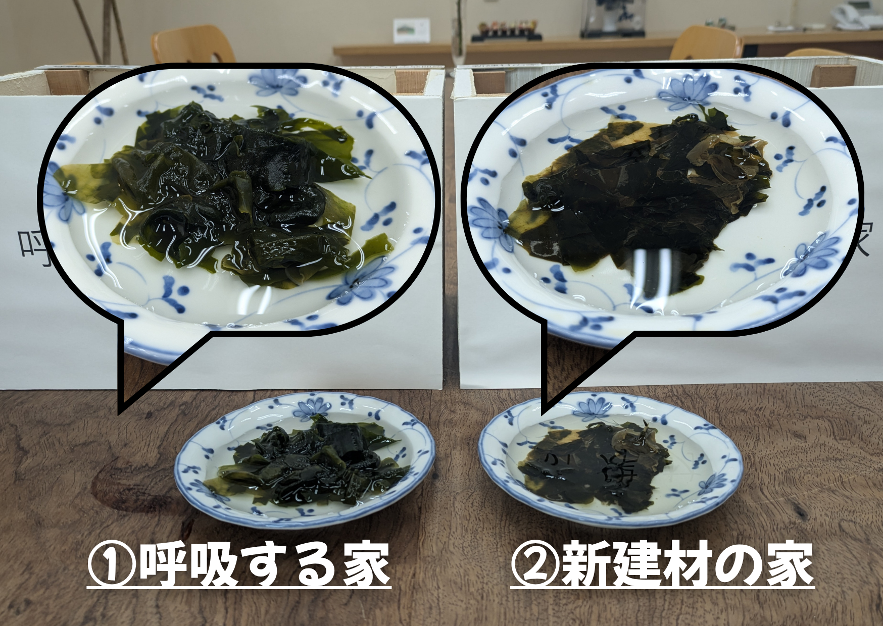 「呼吸する家」では、乾燥ワカメにまた戻って、「新建材の家」では、カビが出て終わり・・・