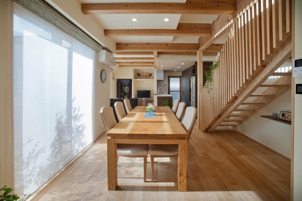 少しづつ深みが増してきた無垢床に経年美を感じる、木造二階建てのおうち。
