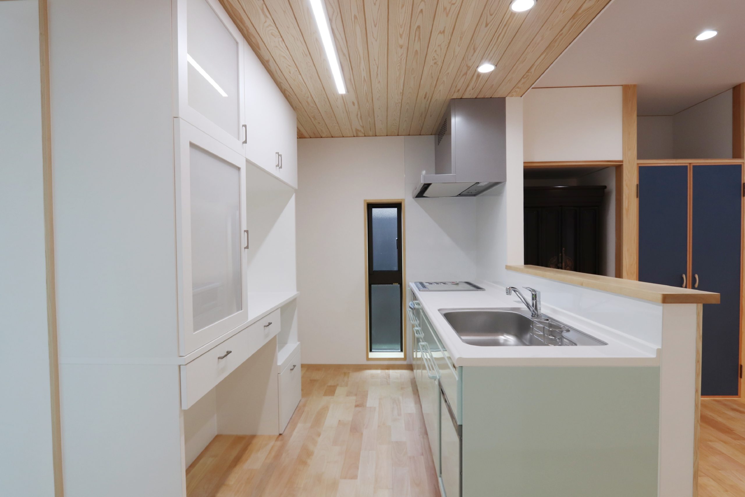 杉板の天井が美しいキッチンスペース。窓側に向いていたキッチンカウンターを対面式にしました。