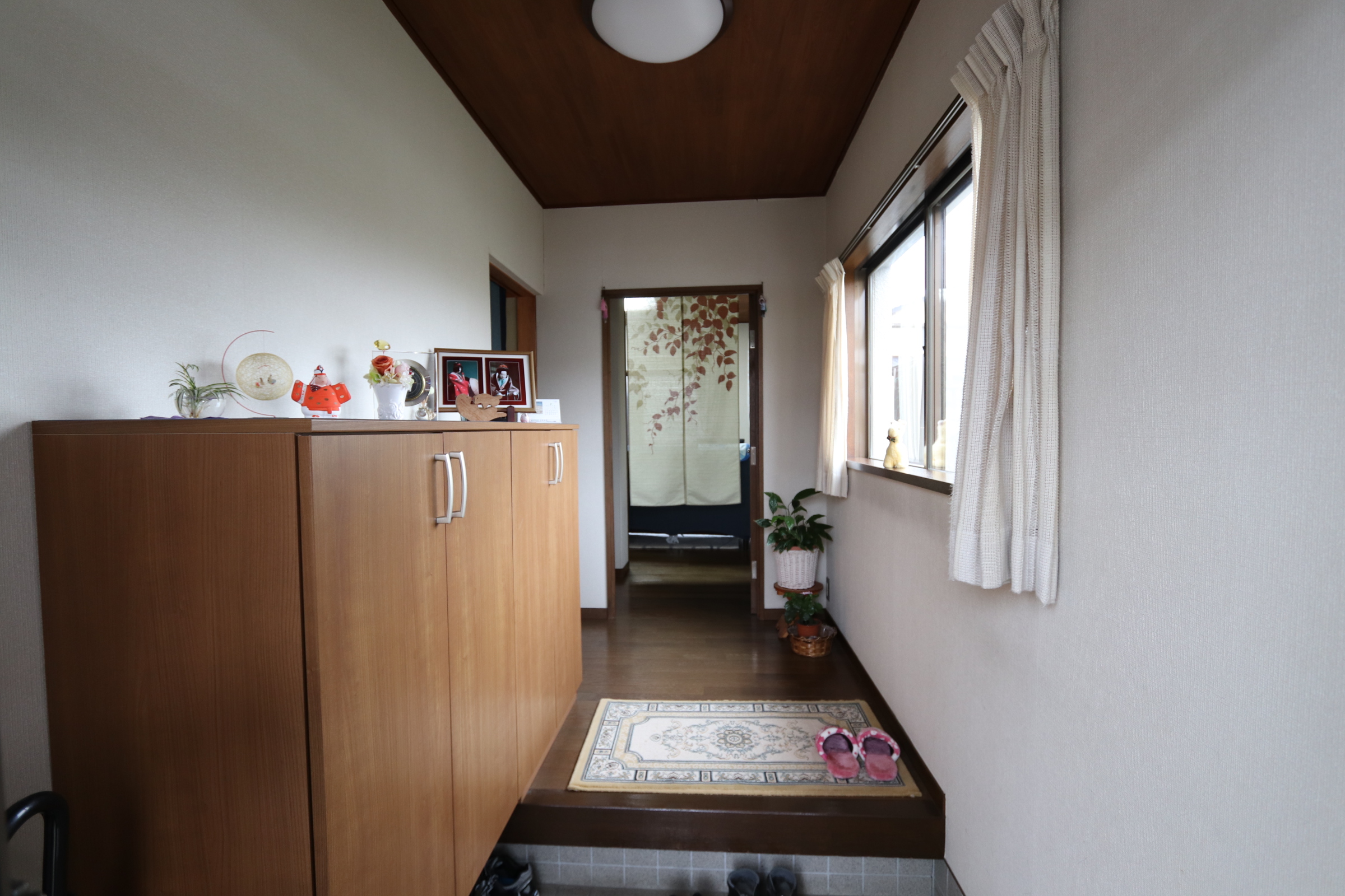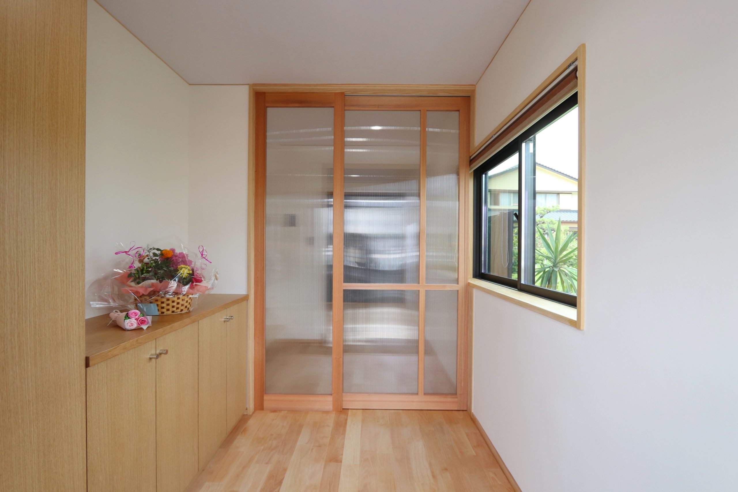 靴箱を壁ごとセットバックさせて広くなりました。明かりを取り入れる内扉は、冷気・暖気を逃がさない役割も果たします。