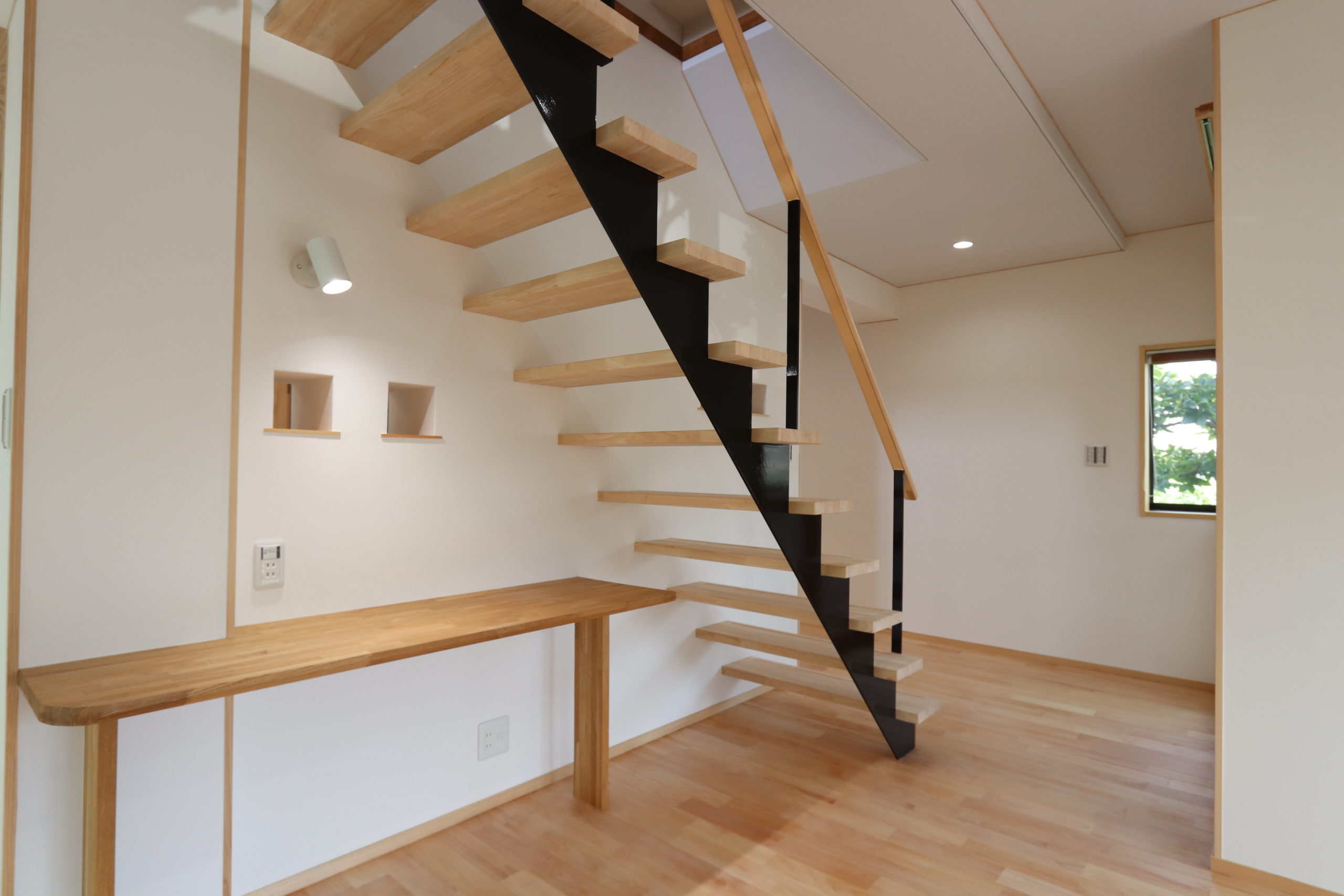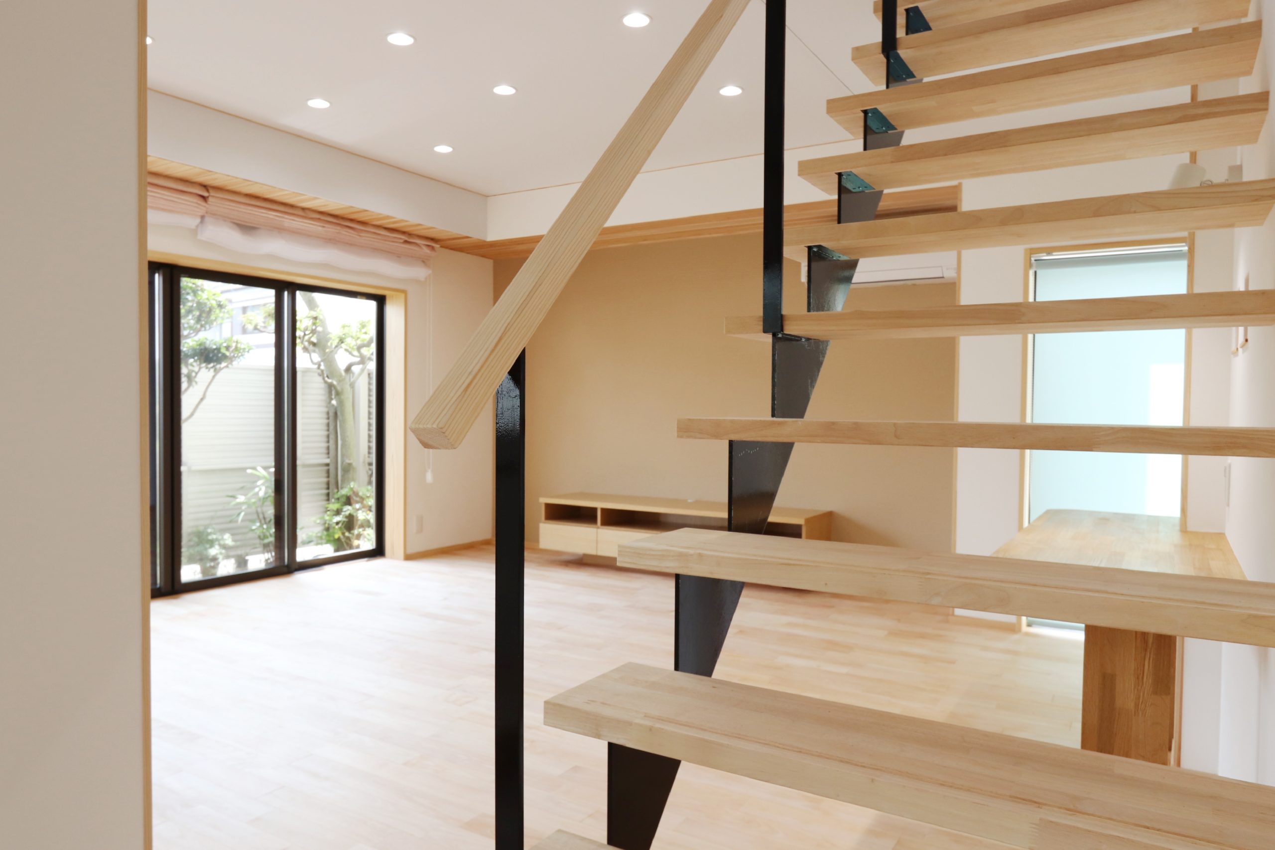 階段下にあった収納を取り払いオープンに。構造上残さざるを得ないキッチンとの間の壁には小窓をあけて空間のつながりをもたせる工夫をしました。手摺のブラックがお部屋を引き締めるアクセントになっています。
